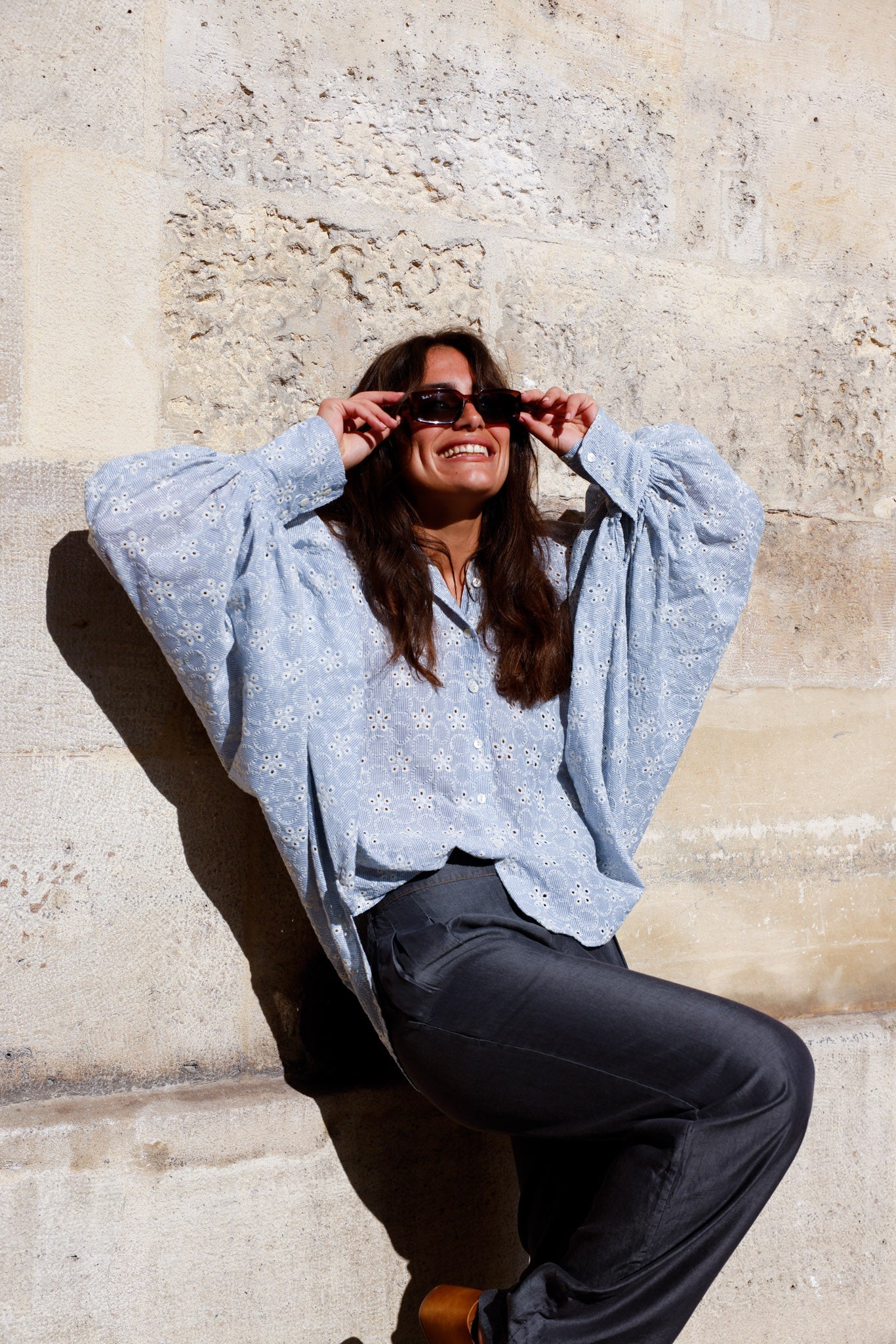 Let yourself be seduced by the bohemian elegance of our Satchi shirt , a key piece of the season. Crafted in a beautiful blue English embroidery , light and delicate, this oversized shirt combines comfort, refinement and freedom of movement.